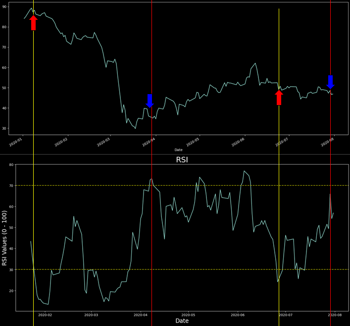 RSI공식을 적용하여 30과 70을 기준으로 체크를 하는 그래프를 만들었다.
